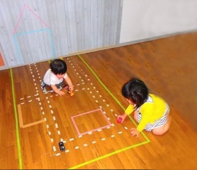 マスキングテープを床に貼って自由に線路をつくります。